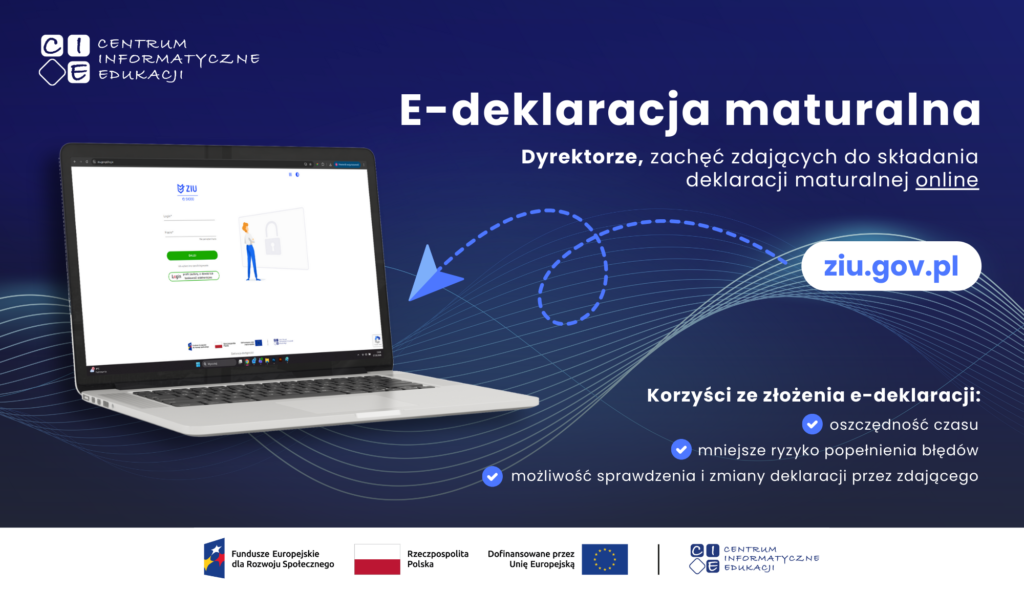 Zachęcamy Dyrektorów szkół do umożliwienia zdającym składania deklaracji maturalnej online, tzw. e-deklaracji. Od kilku lat każdy zdający może samodzielnie wypełnić w systemie Zintegrowany Interfejs Użytkownika (ZIU) deklarację maturalną – po zalogowaniu do ZIU wskazuje przedmioty, które będzie zdawał na egzaminie pisemnym i ustnym. Zdający ma również możliwość zmiany w dokonanym wyborze przedmiotów lub całkowitej rezygnacji z przystąpienia do egzaminu. E-deklaracja jest następnie przekazywana do akceptacji dyrektora szkoły.
